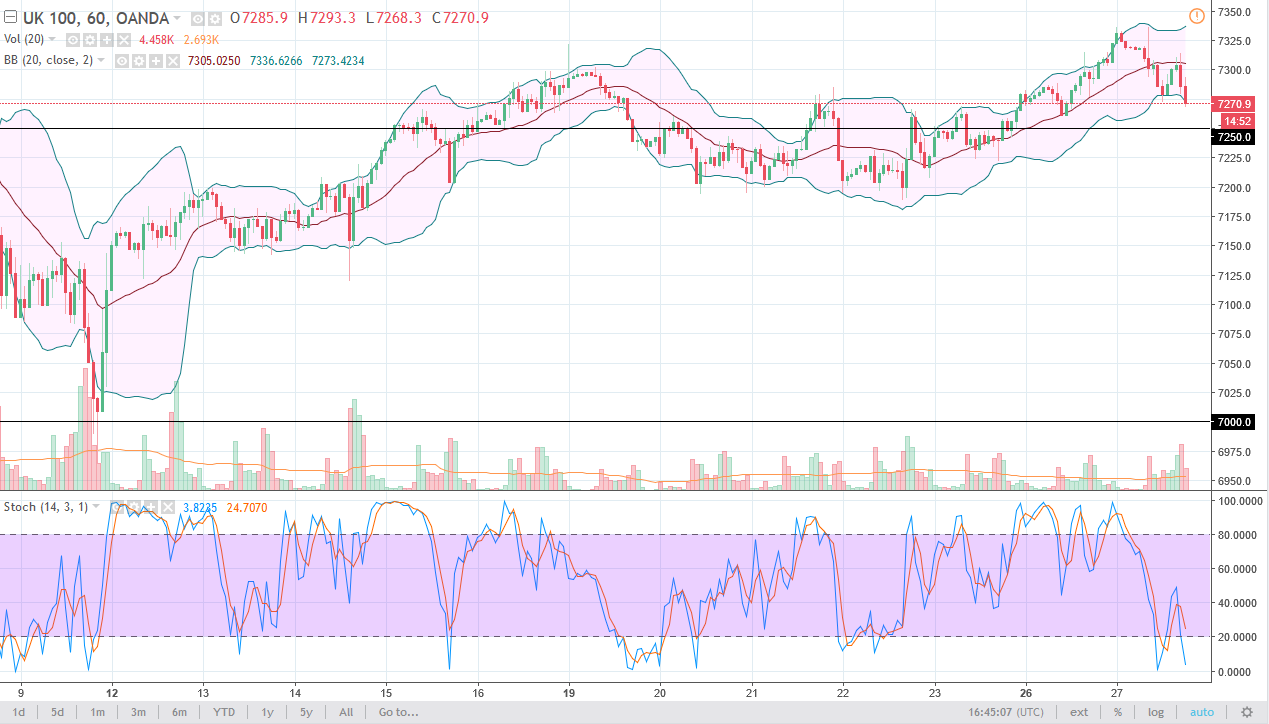 The FTSE 100 sold off during the trading session on Tuesday, reaching down towards the 7250 handle. That’s an area that was important in the past as resistance, so it should be supportive going forward. I believe that the market will find buyers in this general vicinity, extending down to the 7200 level. Ultimately, I believe that the market will continue to be very volatile, but I do think that eventually the buyers get involved as we have recently made a “higher high”, which of course is the hallmark of an uptrend. Also, the FTSE 100 has been rather bullish over the longer term, so I think that value hunters will be looking at this as potential value.