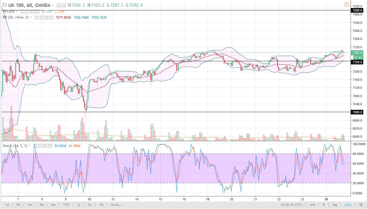 The FTSE 100 rallied a bit during the trading session on Monday, but barely just. It looks as if the 7250 level is going to offer support, just as the 7325 level should offer resistance. If we can break above that level, the market should go much higher.