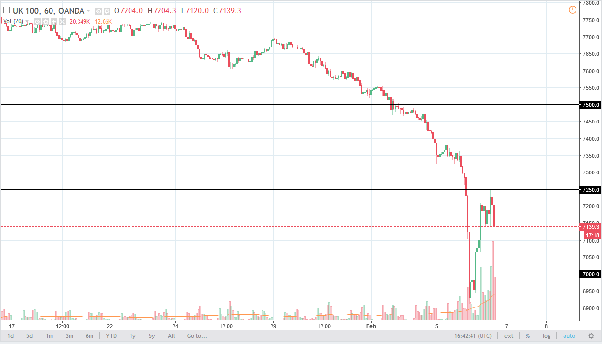 FTSE 100 shaders were very busy during the trading session on Tuesday, as we reached towards the 7250 level but then pulled back significantly. The 7000 level during the previous session of course is massively supportive, and I think at that level a lot of value hunters had come back into the marketplace. I think that if we can break above the 7250 level, the market should then go towards the 7350 handle, and then make a move towards the 7500 level. This is a market that has been oversold for some time, and value hunting makes quite a bit of sense.