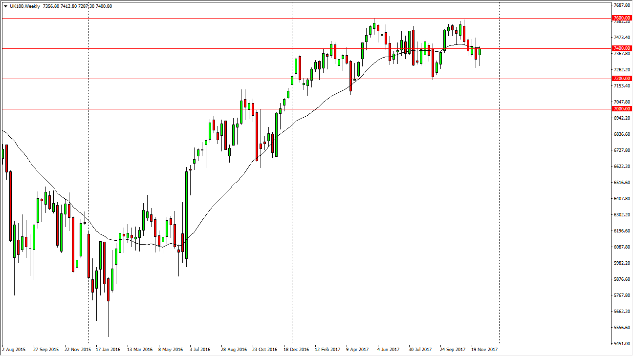 The FTSE 100 has pulled back during the week, but found enough bullish pressure to turn around and form a hammer. A break above the top of the hammer should be a bullish sign, perhaps send in the market towards the 7600 level. Because of this, I think that the market should continue to be volatile, but it seems likely that we will struggle between here and there. Given enough time, I anticipate that the FTSE 100 will break above the 7600 level, as the negotiations between London and Brussels seem to be going better than originally thought. At this point, I suspect that the United Kingdom will start to look relatively cheap, and therefore I think that we will see the FTSE 100 extend the gains.