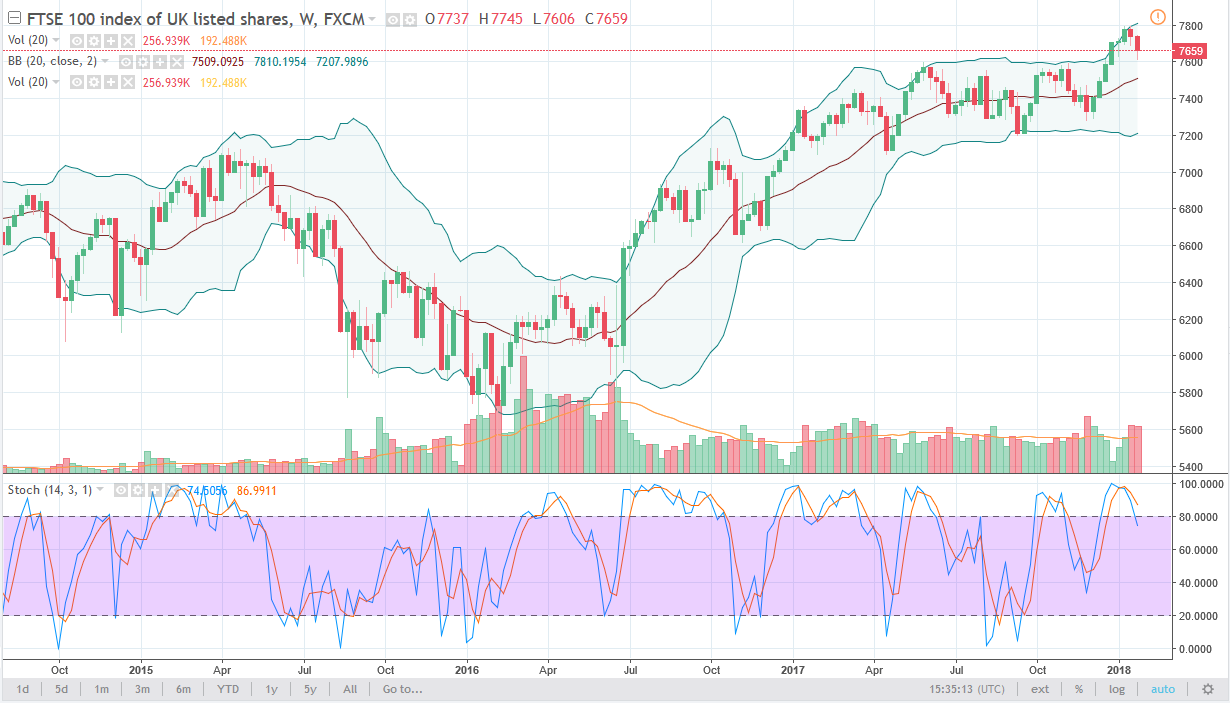 The 7200 level being broken to the downside would be very negative, perhaps sending this market to the 7000-handle next. A breakdown below there turns the market around completely but I don’t think that there is more than about a 10% chance of this happening. Granted, the GBP/USD pair rallying over the last couple of weeks hasn’t helped, but in the long-term I believe that we will continue to see the FTSE looked at as an opportunity to the traders to take advantage of what should be a stronger moved to the upside.