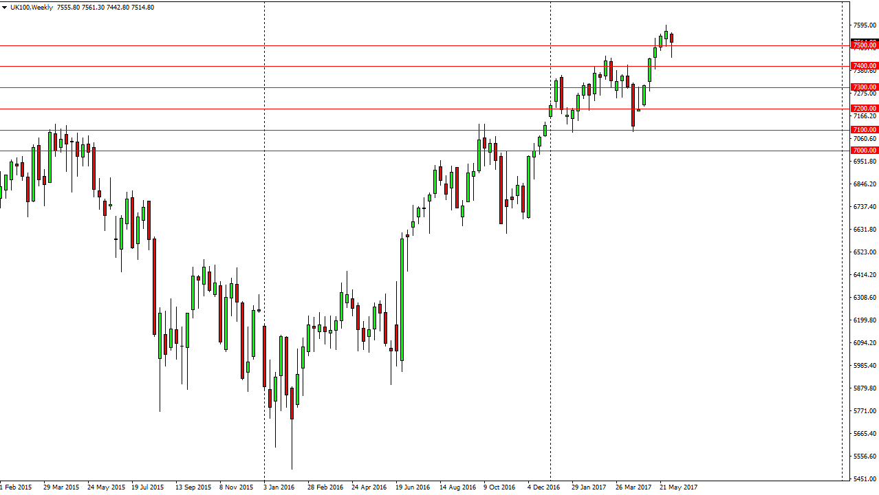 The FTSE 100 fell during the week, reaching all the way down to roughly 7425. This of course was exacerbated by the surprise UK elections result, but by