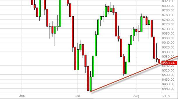 The FTSE initially tried to rally during the session on Friday again, but just as we saw on Thursday, sellers came into the marketplace and pushed the index down. With that, we feel that the FTSE may breakdown fairly soon, but also recognize that there is an uptrend line just below that could keep this market somewhat afloat. If we can break down, we feel that the market will probably reach towards the 6500 level next, and then perhaps as low as 6450. At this point in time, we recognize that the time a year lends the markets to look for selling as liquidity just simply isn’t there.