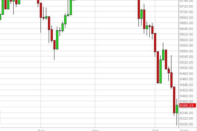 The FTSE as you can see fell during most of the session on Monday, but bounced off of the 6300 level in order to form a hammer. This hammer sits just below the 6400 level, and a move above that level would in fact be very positive as far as we can see, simply because it would be a reentry into the consolidation area that we had been in previously. On the other hand, if we break down below the 6300 level, we think that would be a very negative sign as we should then head to 6000.