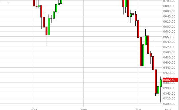 If we do break down, the 6000 level should be rather supportive, but quite frankly it’s only a matter of time before the buyers would step been based upon value as well, and with that we feel that the market should eventually get its footing again. After all, the British economy is better than the European economy, so by a simple proximity we feel that Europeans will put money into the FTSE instead of risking it on the continent as long as things look this poorly.