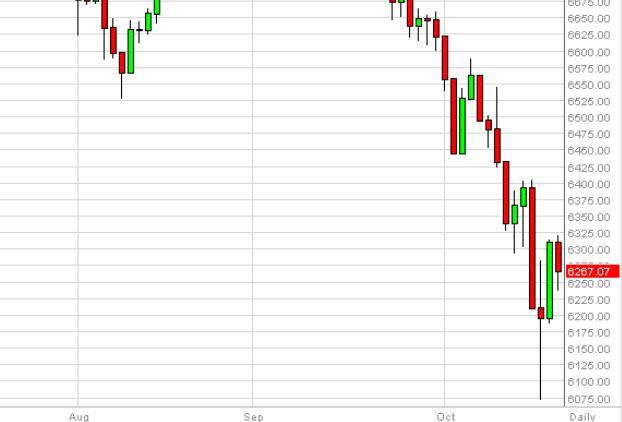 The FTSE as you can see fell during the session on Monday, just as the rest of the European markets did. That being the case, the market feels as if it is trying to find some type of support in this area, and we certainly have formed a nice-looking hammer on the longer-term chart in order to suggest that the weekly time period looks very supportive. That being the case, we are buyers and not interested in selling, because we feel that the market should go back to the 6400 level, and a break above that should be a longer-term opportunity to buy the FTSE.