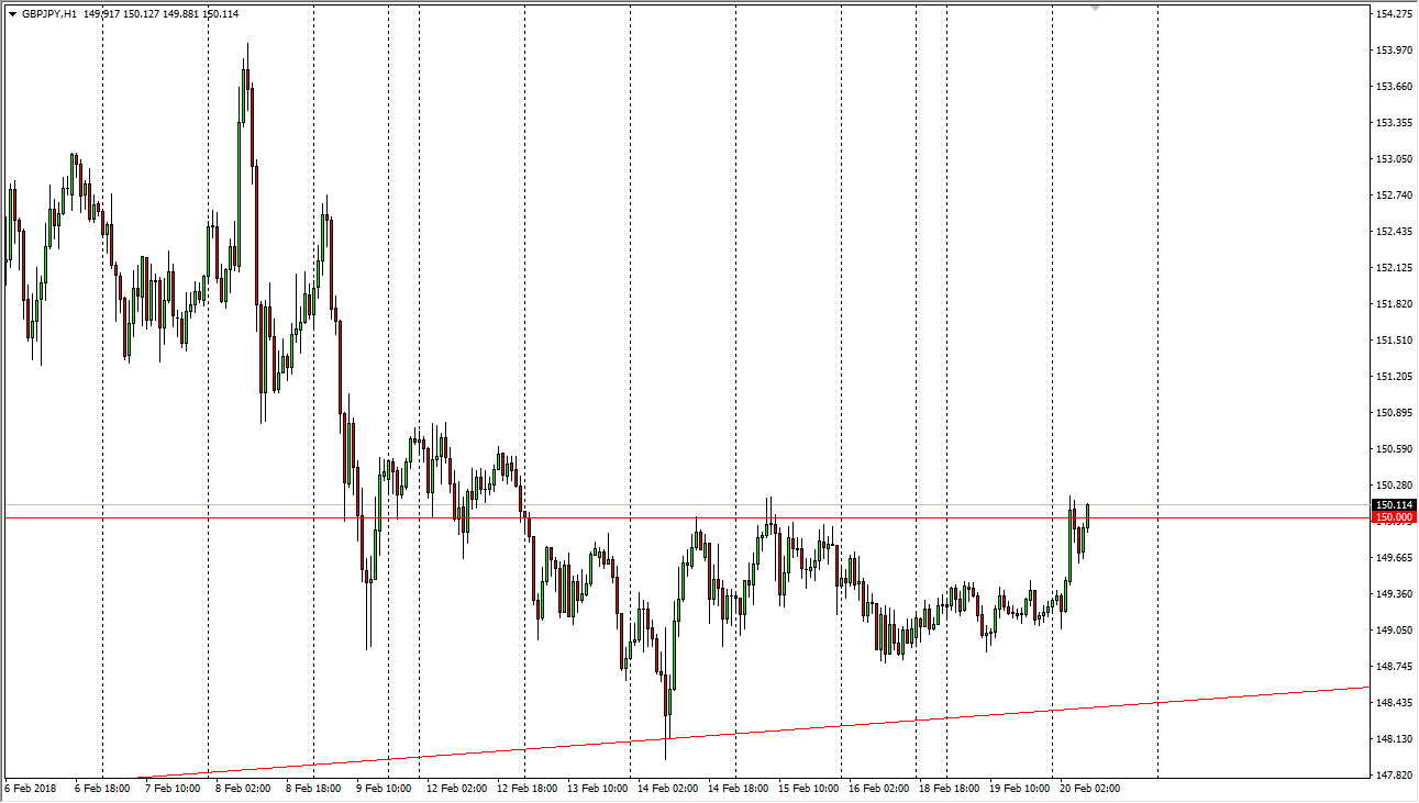 If we can break above the 151 handle, the market is very likely to go towards the 153 handle, which is the next resistance barrier. I think that this is a market that will continue to be difficult, especially for the newer trader as they may not be used to the damage that this pair can do to their account, but on the other side of the equation is that it can lead to rapid gains. The question is whether you can deal with the volatility, or even easier – play with a small position. I think that’s probably the best way to go, adding slowly and incrementally. On a break above the 151 handle, I think that we will see fresh money coming back into this pair. Longer-term, I anticipate that the uptrend continues.