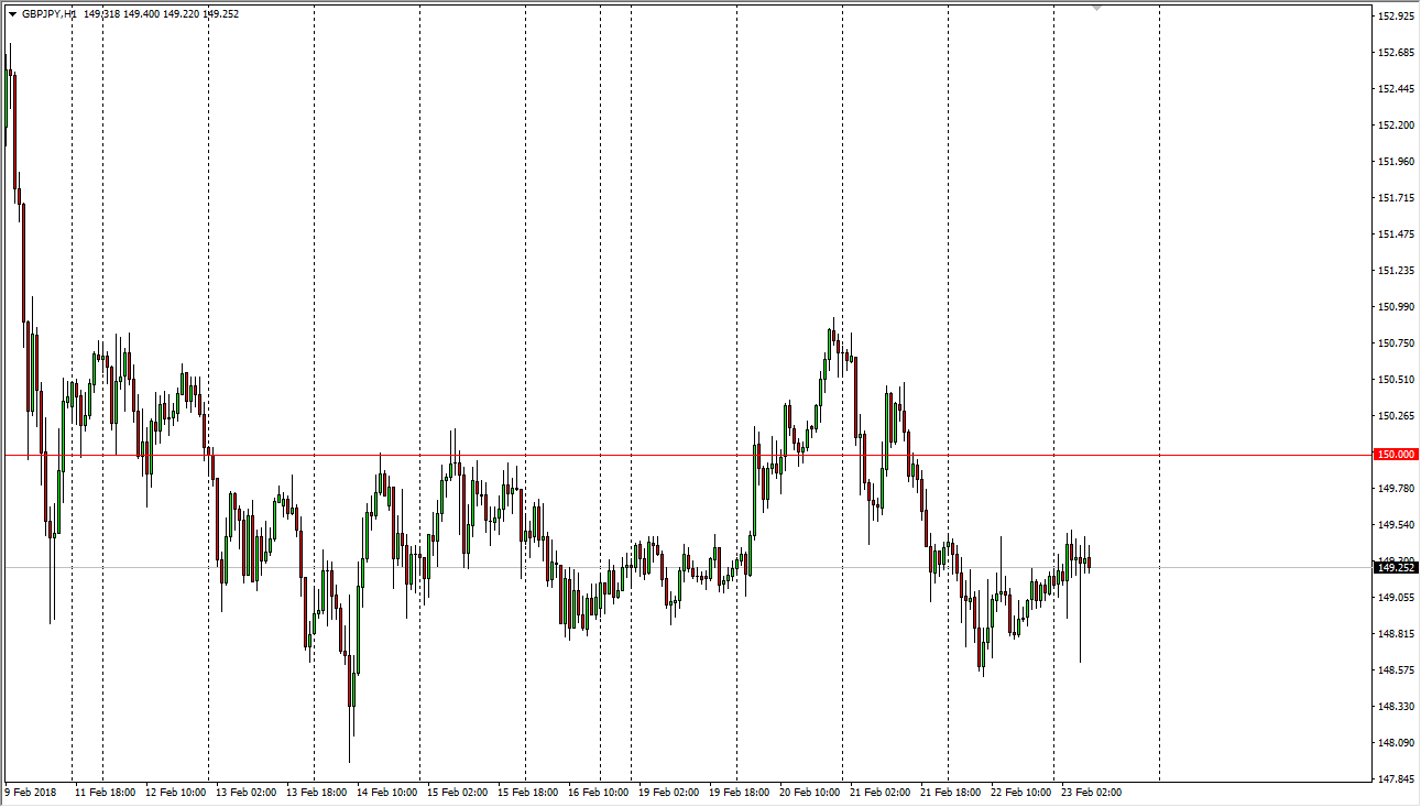 Ultimately, I believe that the market should continue to see a lot of noise, so you need to be very careful. Small positions will probably continue to be the best way going forward, as the volatility will make trading this market very dangerous. I think eventually we will get some type of impulsive move, and when that happens I’m willing to jump in rather stringently. If we break down below the bottom of the weekly candle, making a fresh new low at the 148.50 level, I would become aggressively short, because it would be a breakdown of not only the weekly Lowe’s, but the uptrend line that has been keeping the market higher. On the other hand, rallying from here will probably be done rather slowly.