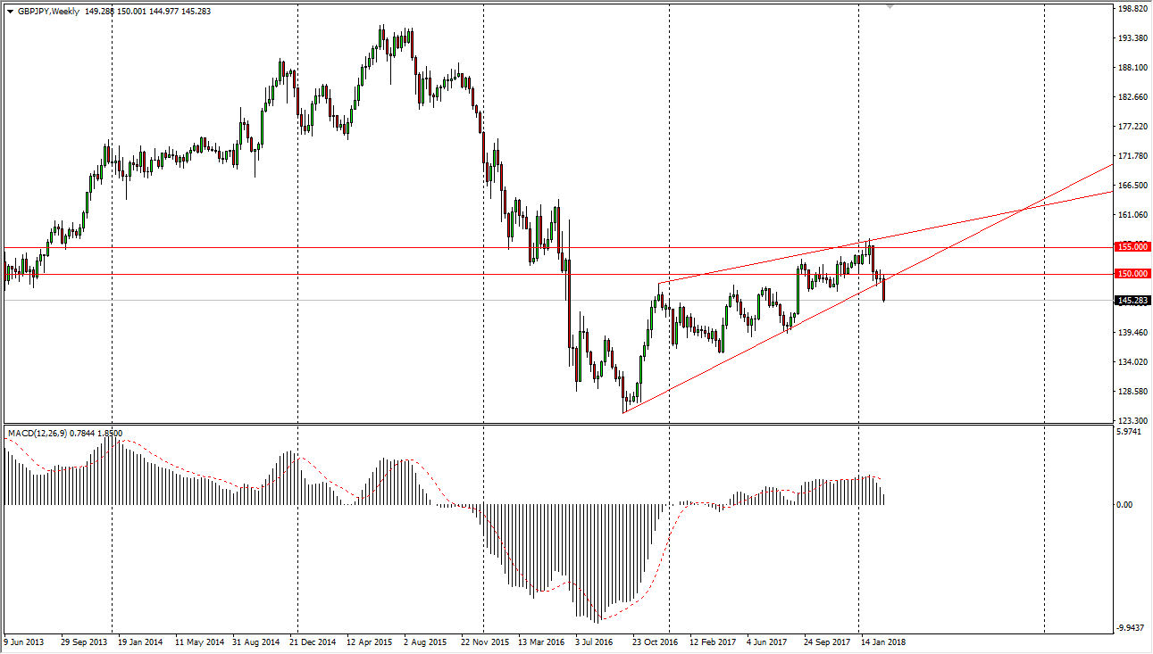 The British pound initially tried to rally during the week against the Japanese yen but found the 150 level to be far too resistive to continue going higher. We have since broken down below an uptrend line, a very negative sign indeed as we approach the 145 handle.
