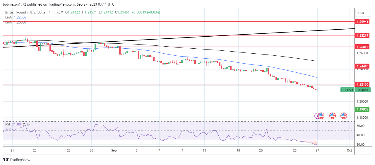 The GBP/USD pair sat below the 50-day and 200-day EMAs, sending bearish price signals. A fall to $1.21000 would bring the $1.19055 support level into play.
