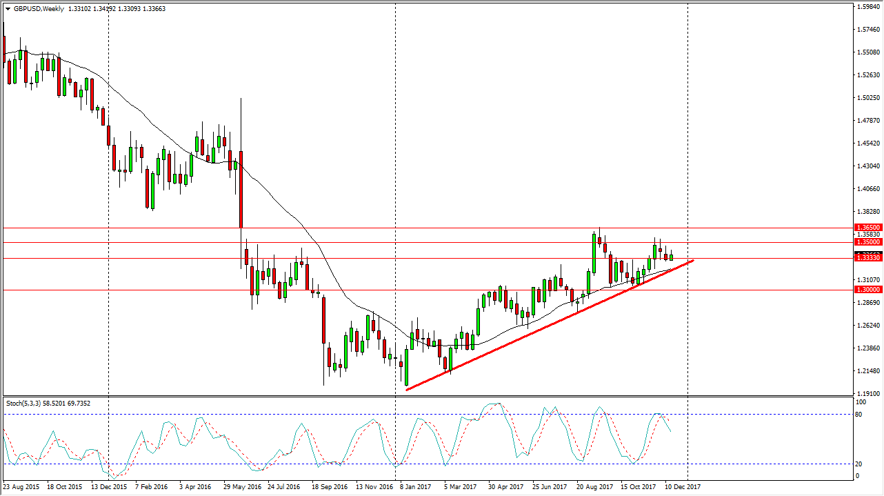 The British pound rallied a bit during the course of the week, breaking above the 1.3333 handle. That being the case, the market should continue to go higher, reaching towards the 1.35 level above. That is a market level that a lot of traders have paid attention to, and I think that we will go looking towards that level next. If we can break above there, the market should then go to the 1.3650 level. The markets offer a nice long-term buy-and-hold situation from what I see, but there is going to be a certain amount of volatility. If we can break above the 1.35 handle, I think that the market could go to the 1.3650 level. That is an area that being broken to the upside would signify a huge shift in the attitude of British pound traders, as we could go much higher.