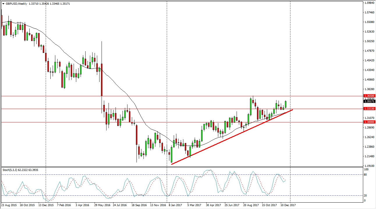 The British pound has rally during the week, breaking above the top of the last few weeks, breaking above the top of the shooting star like candles. Because of this, it looks as if the British pound is going to continue to find buyers, and the short-term dips will probably offer value that you can take advantage of. I believe that the 1.3650 level above is a massive resistance barrier, but right now it looks as if it will be broken given enough time. The weekly candle is strong, and the uptrend line just below looks to be offering quite a bit of support as well. Because of this, I believe that the 1.3333 handle is now offering a bit of a floor in the market, and it’s only a matter of time before we not only break above the 1.3650 level, but continue to go much higher. I think that the British pound is probably going to be one of the better performers during the beginning of the year, and I think it’s only a matter of time before the buyers jump all over this bandwagon.