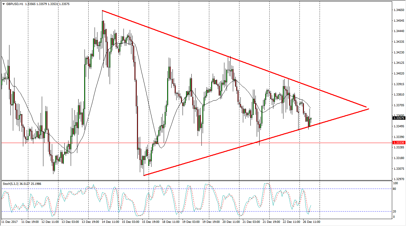 The British pound should continue to find buyers underneath, and although the market has been very quiet, most of this can be written off due to the time of year, and of course I believe that the 1.3333 level is of course one of the most important levels on the chart. I think that if we can stay above that level, it is only a matter of time before the markets break out to the upside, and go reaching towards the 1.35 handle above, which of course is a large, round, psychologically significant number. Looking at the triangle on this chart, I think it’s only a matter of time before we get a move, and eventually we will be able to follow it.