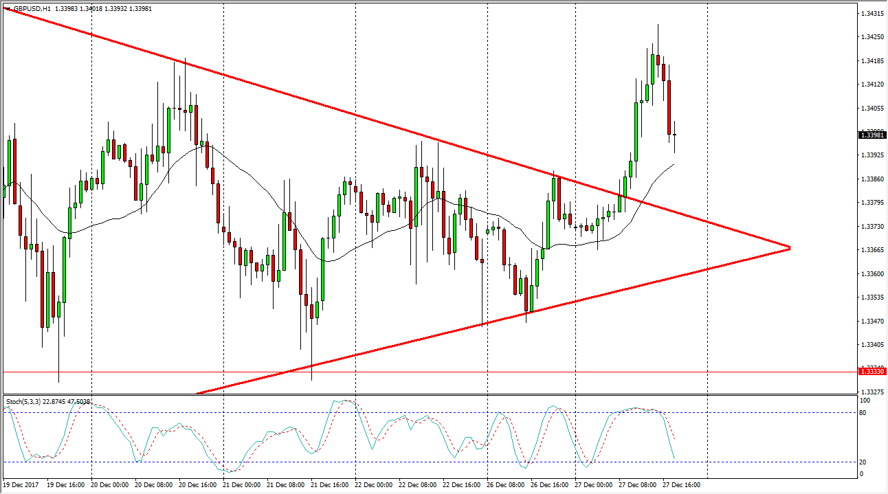 The British pound has rallied significantly during the day on Wednesday, but turned around at the 1.3430 level, and fell right back towards the symmetrical triangle that we have broken out. Low-volume makes this a bit of a suspicious move though.