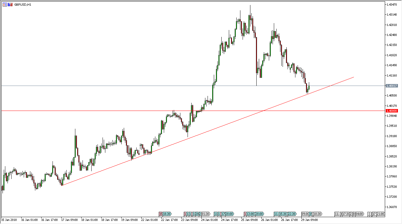 The British pound has dropped a bit during the trading session on Monday, in what has been a relatively quiet day. The market seems to be taking a bit of a breather, and what has been a very strong uptrend. I look at this chart and recognize that the short-term uptrend line has been reasonably productive, but the 1.40 level underneath is even more supportive, and it is now a significant area where buyers could be involved. The 1.40 level should attract a lot of attention, as it was a major breakout. This pullback has been a bit substantial over the last couple of days, but in the end, it’s likely that the pullback will be looked at as an opportunity to pick up value in what has been a very strong currency. I anticipate that we uptrend line, but at the end of the day it’s not a cell signal, rather it’s a signal to start picking up value closer to the 1.40 level. Alternately, if we break above the 1.4150 level, the market is likely to continue its uptrend that we have seen for some time.