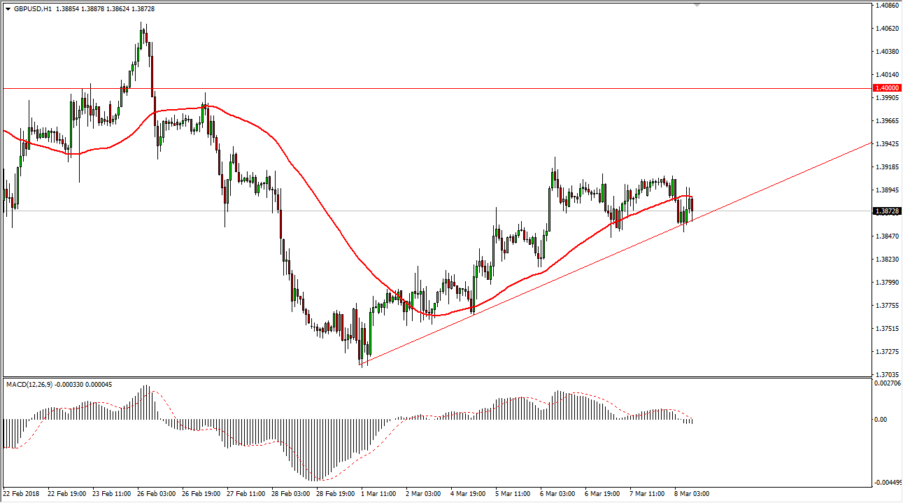 The British pound went sideways overall during the trading session on Thursday, as we are starting to test a minor uptrend line. This uptrend line will probably give way, and if it does I think will go looking for support at lower levels. Alternately, if we bounce and go above the 1.39 level, then I think the market is free to go to the 1.40 level. Overall, the US dollar has done reasonably well during trading, and that could be more what’s driving this market than anything else. I don’t think that it has much to do with the British pound and seems to be more of a dollar centric move.