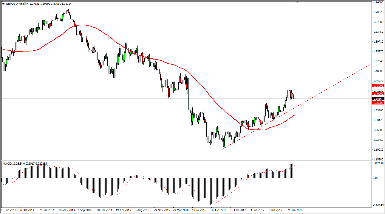 The British pound had rally during the week, but the 1.40 level continues to offer resistance. I think that breaking above that level should send this market to the 1.43 level, the most recent high. Overall, I am a buyer of this pair, but I recognize that there is a significant amount of resistance above that will continue to be difficult. However, if we were to break down below the uptrend line, the market will probably unwind back down to the 1.30 level. This is a market that continues to find value hunters jumping in, and this most recent pullback should offer plenty of opportunities for those that are willing to wait for signs of support and of course a rebound.