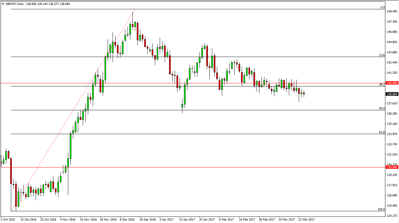 The GBP/JPY pair initially rally on Friday but turned around to form a red candle. This is a market that continues to grind a little bit lower, but I see the 50% Fibonacci retracement level as being very important. On the other day, we can break above the 141 handle, the market should be able to go higher. Currently, looks as if a slower drift to the downside is probably will we are going to see, especially with the Article 50 coming so soon. Supportive daily candles might end up being buying opportunities going forward.