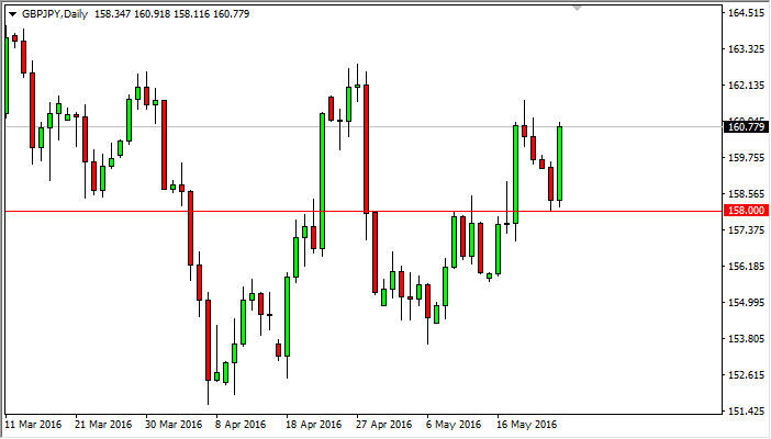 The GBP/JPY pair broke higher during the course of the session on Tuesday as the 158 level offered quite a bit of support. That supportive of course lifted the market much higher, and it appears that the markets will continue to find quite a bit of bullish pressure. I believe that the 158 level below is essentially the floor”, and as a result future pullbacks should continue to find buyers in this market, and eventually we could break out to the upside. However, expect a lot of volatility, because it is very difficult to deal with all of the noise.