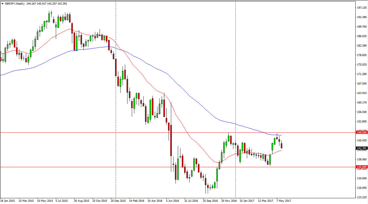 Looking at the chart on the weekly period, it looks as if we are trying to for some type of consolidation and if that’s the case, we probably will continue to go little bit lower. I do see a significant amount of potential support at the 140 level though, so that could also cause a bit of a bounce. Pay attention to the futures markets, as well as stock markets. If they start to fall, it’s likely that the market here will drop as people will be running to the general safety of the Japanese yen at that point. Either way, it’s going to be a volatile market, as it typically is. If we were to somehow turn around and break above the 148.50 level, we then it could continue to grind higher, perhaps as high as the 160 level. With the divorce proceedings from the European Union going on in London, there will continue to be volatility.