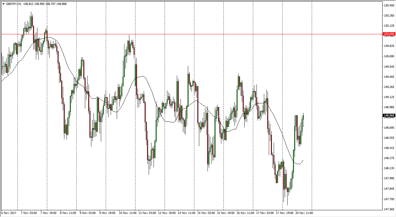 The British pound drift a little bit lower at the open on Monday, but found enough support at the 147.50 region to turn around and explode to the upside. As I record this, we are currently testing the 149 handle, an area that should be significant resistance. I believe there’s a lot of noise between here and the 150 handle, so I’m waiting for an opportunity to short signs of exhaustion on rallies, such as the one we find ourselves and now. After all, we have continued to make lower lows, and have yet to make a “higher high.” This is a very definition of a downtrend, but is also a very choppy market as “The Dragon” typically is. Keep in mind that this pair does tend to move with the overall risk appetite around the world, so if stock markets start to rally significantly, that could be good for this market as well. Obviously, the exact inverse is possible as well, as the Japanese yen tends to be thought of as a safety currency.