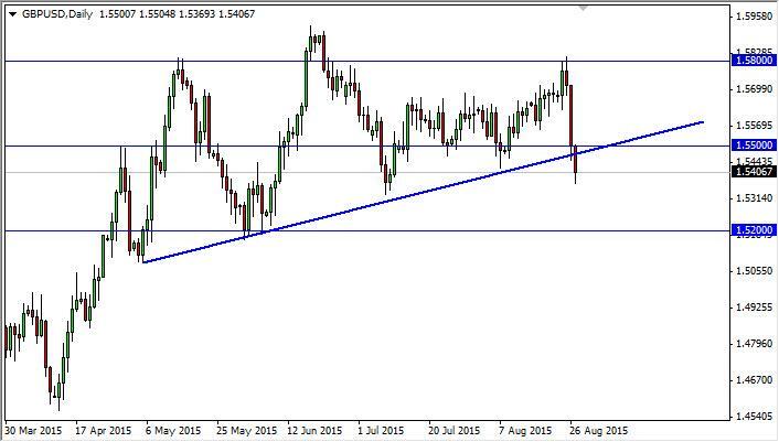 The GBP/USD pair broke down below the bottom of the uptrend line that has been supporting the market all summer during the day on Thursday. Because of this, we feel that this market is probably going to continue to see softness, and as a result short-term rallies that show signs of exhaustion should be selling opportunities now. The 1.52 level below should be supportive, and as a result we think that the market will probably stop there. However, we think that something as change, and as a result it looks like we may start dropping from here.