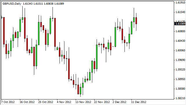 The GBP/USD pair fell during the session on Thursday after forming a shooting star on Wednesday, which of course is a classic sell signal. However, the pair pulled back slightly only to bounce and formed a hammer like candle for the Thursday session. Because of this, we believe that this market will continue to grind higher, and try to move above the 1.6200 level in the short-term. As for selling, we see far too many minor support levels below in order to do so. We remain bullish of this marketplace, and still believe in the pair going as high as 1.70 sometime in 2013.