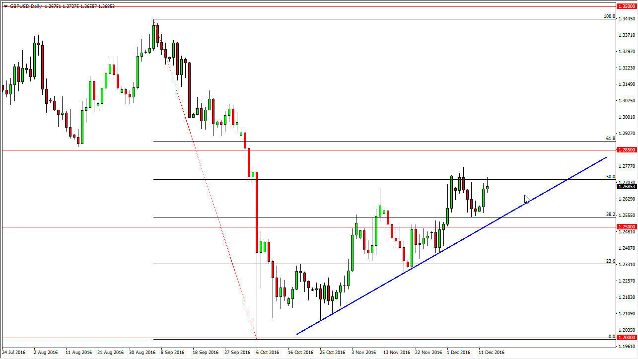 The British pound initially tried to rally during the day on Tuesday, but found the 50% Fibonacci retracement level at the 1.27 level be far too resistive to continue going higher. By doing so, we rolled back over and ended up forming a bit of a shooting star. I think that we will probably reach down towards the uptrend line now, as we are starting to make a “lower high”, assuming that we can break above the top of the shooting star today. Even if we did, I think that the 1.2850 level above is the “ceiling” in this market.
