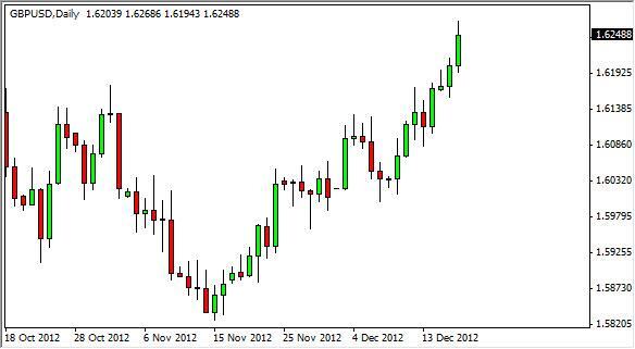 The GBP/USD pair shot straight up during the Tuesday session as we broke above the 1.62 handle. This area signified a resistance level that finally has given way, and because of this, it does look like we will reach for the 1.63 handle and beyond. We have been very bullish of this market for quite some time, and will continue to be so. We believe a break above 1.63 signifies another leg up in this already bullish market. We see no reason whatsoever to start selling at this point. In fact, we believe this will be one of the better buy-and-hold trades of 2013.