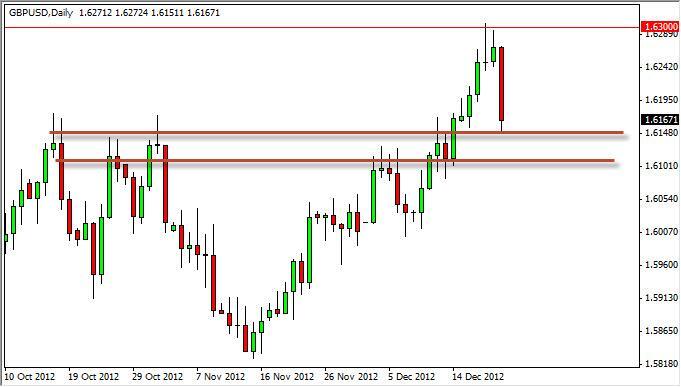 The GBP/USD pair fell precipitously during the Friday session as the “risk off” trade came back into play. With the failing of the so-called “fiscal cliff” talks, this market absolutely cratered. However, you can see that roughly the 1.6150 level offers support, and as a result we could see a bounce from this level. It should be noted however that the weekly candle is a shooting star, so we could see a pullback coming at us. We will simply wait to see how this market reacts to the 1.6150 area, and place our trade accordingly. We still believe in the long-term viability of the bullish market, and as such actually prefer to buy even though we’ve seen a significant pullback.
