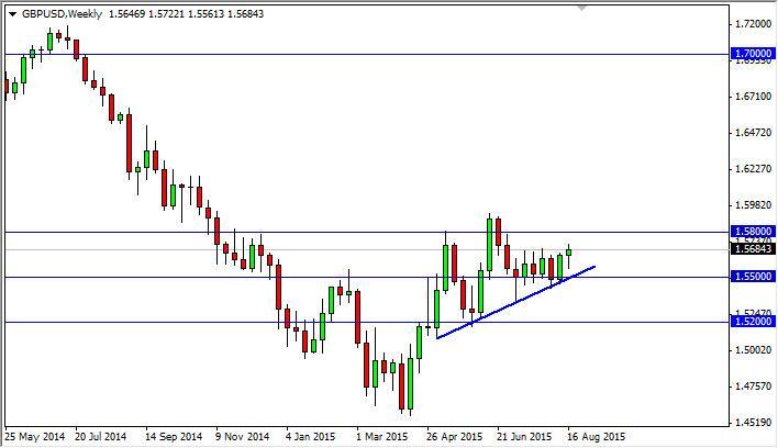 The GBP/USD pair initially fell during the course the week but found enough support below to turn things back around and form a hammer. With that being the case, the hammer looks as if it is telling us that the markets going to try to reach towards the 1.58 level, and then ultimately the 1.60 level. We have no interest whatsoever in selling this pair, and believe that any pullback and we get at this point in time will end up being a buying opportunity given enough time.