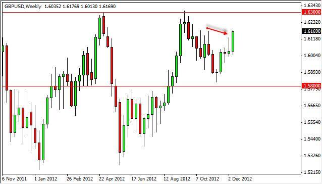 The GBP/USD pair shot straight up during the week as we busted through the top of the shooting star that we formed the previous week. The market closed just above the 1.6150 level, and then managed to even close the very top of the range. Because of this, and the fact that this area has offered a bit of resistance previously, we think that a move above the highs from the week should signal a run to the 1.63 handle in relatively short order.