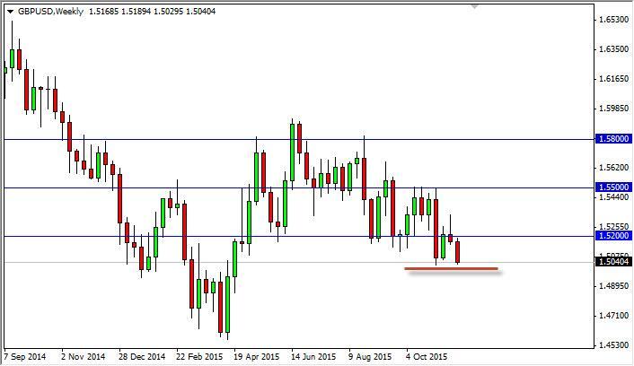 The GBP/USD pair initially tried to rally during the course of the week, testing the 1.52 level for resistive action. It did in fact find it in that area, and as a result we turned back around and fell all the way back down towards the 1.50 level. The 1.50 level should be supportive based upon the fact that it is a large, round, psychologically significant number, and of course the fact that was previously support and resistance back during the end of last year.