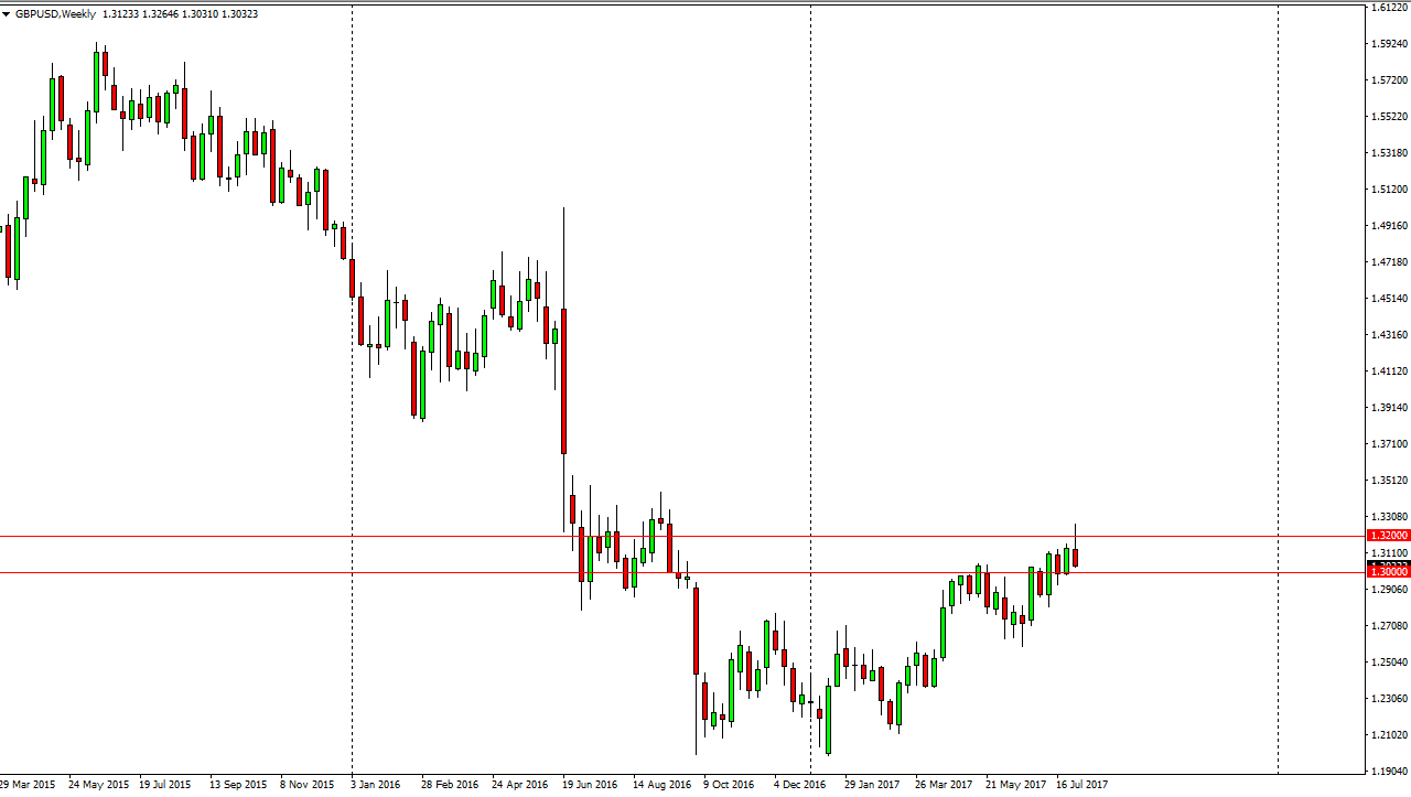 The GBP/USD pair initially tried to rally during the week, and even got above the 1.32 handle. However, we have turned around drastically and fallen towards the 1.30 level. The British pound got a bit of a “double whammy” during the week, as the Bank of England suggested that it was going to be at least 2018 before we sought interest rate hike, and then the jobs number in the United States ended up being stronger than anticipated. This drove US dollar strength, which of course is reflected in the chart. Ultimately, I think that the 1.30 level is important, and a breakdown below there should send the market to the 1.2850 level next.