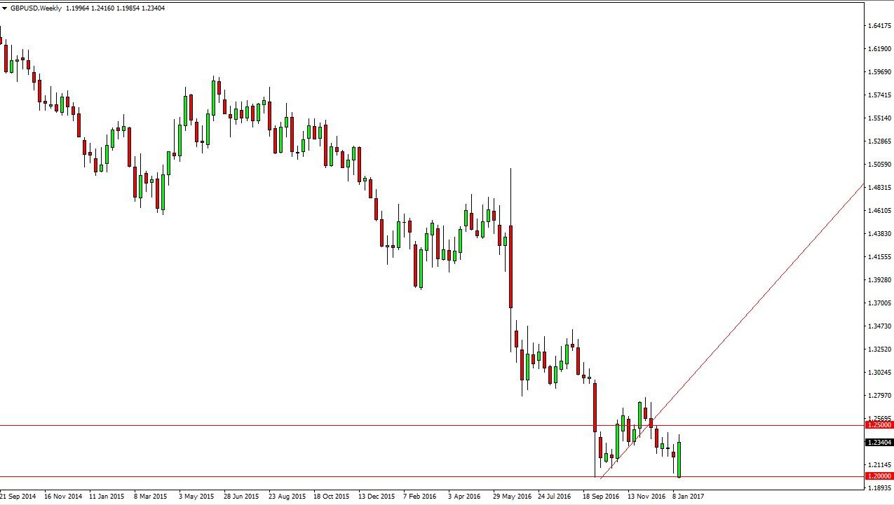 The British pound bounced off of the 1.20 level underneath to form a very strong looking candle, engulfing the hammer from the previous week. If we can break above the 1.25 level above, I believe that the market will continue to go higher. In the meantime though, it’s probably easier to deal with this market from a shorter-term perspective rather than the weekly chart. If we breakdown below the 1.20 level, that would be catastrophic. Regardless, I think you can count on seen quite a bit of volatility in this market.