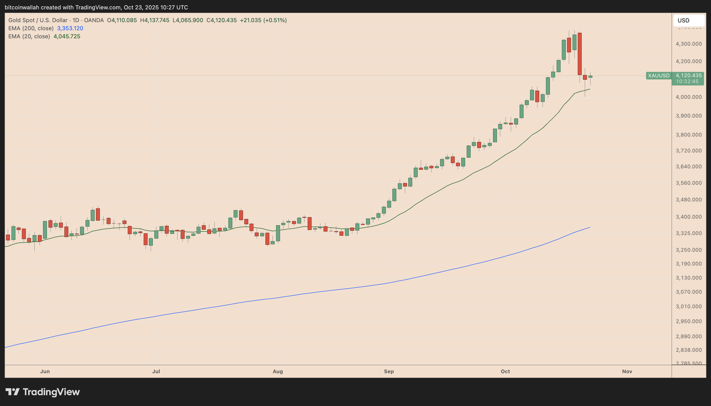 Overheated correction seems to be the case in the gold market, wherein lofty valuations are pushing investors to lock in profits. The metal is still holding above a key support at the 20-day exponential moving average (20-day EMA; the green wave) near $4,044.