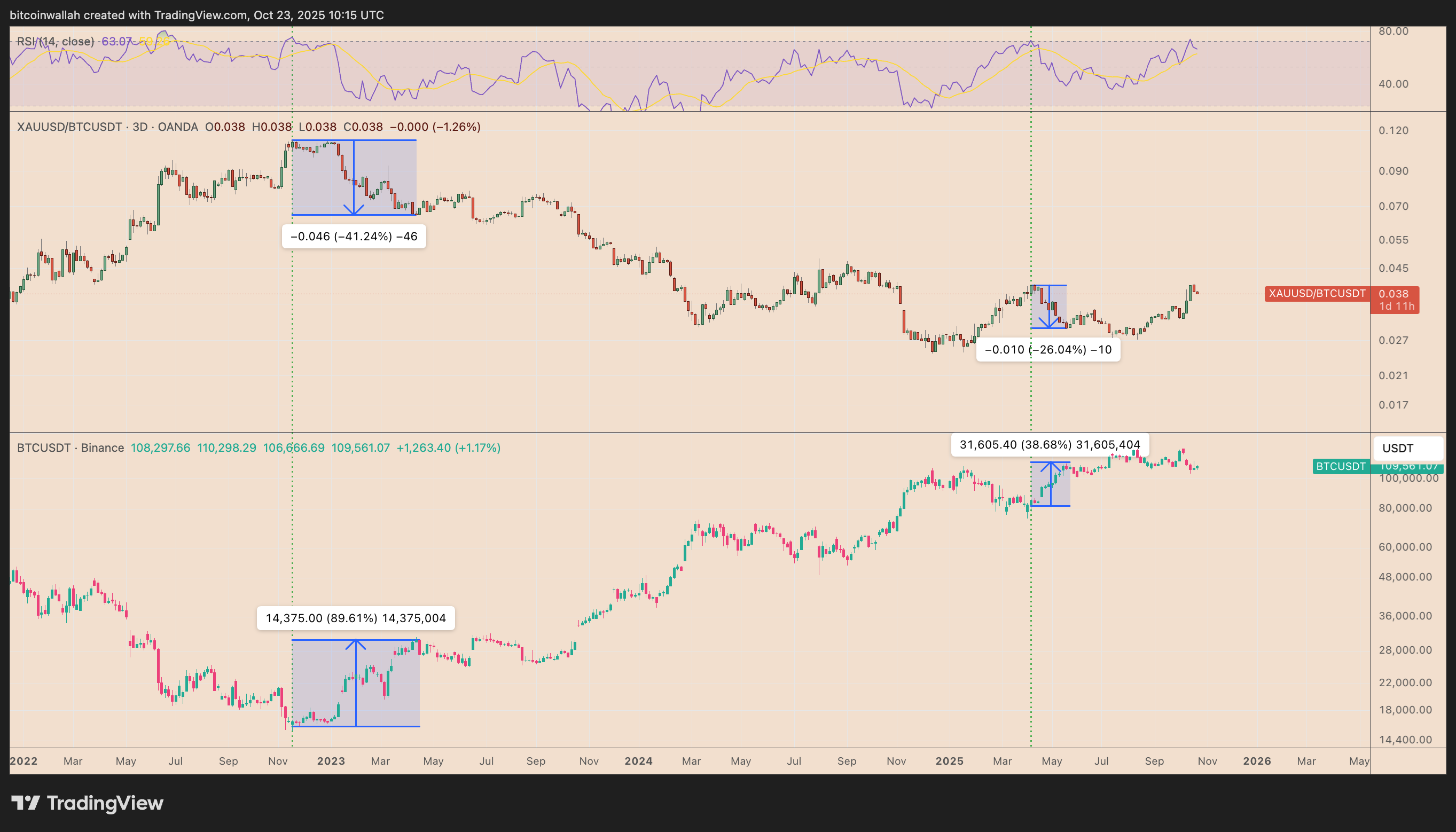 In late 2022, XAU/BTC’s RSI spiked above 70, preceded by a 41% decline in the ratio, while Bitcoin rallied nearly 90% from $15,000 to $28,000. A similar setup emerged in early 2024 when the RSI again hit the overbought zone, followed by a 26% gold-to-BTC drop and a 38% rise in BTC.