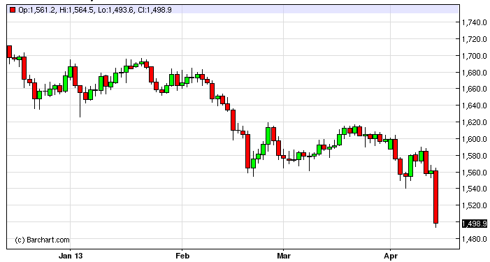 We think that the market more than likely drops to the 1450 level in the short term, and could fall much farther than that. Ultimately, this market will eventually be a screaming buy, especially considering everything that’s going on the central banks and their incessant printing. After all, we are in the middle of a currency war, and eventually everybody loses. Looking forward, there will come a day where we start to see $50.00 gains over the course of the session, and volatility will certainly pick up. At this point in time however, the gold market certainly has had significant support smashed through. In fact, the market continues to accelerate to the downside as we type up this report. Currently, the market is actually down to the $1485 level, and as a result this looks like a market that is simply going to continue to the downside.