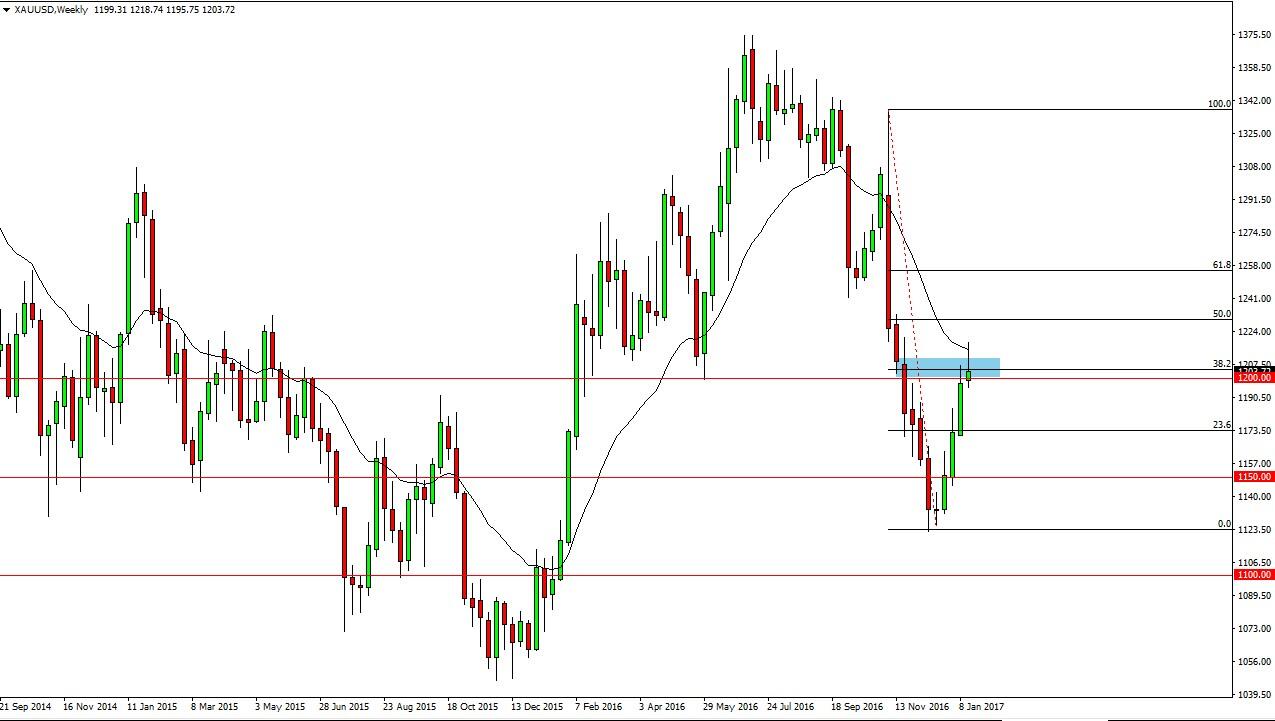 There is a longer-term downtrend in effect at the moment, and because of that it’s likely that the sellers will be very interested in this market. After all, just above there is a massive amount of resistance just above as we had seen so much in the way of support during 2016. Because of this, I think that ultimately the gold markets will fail as it has been suggested by Philadelphia Federal Reserve Pres. Harker that we should see three more interest rate hikes during the course of the year. That of course is good for the US dollar, which typically works against the value of gold.