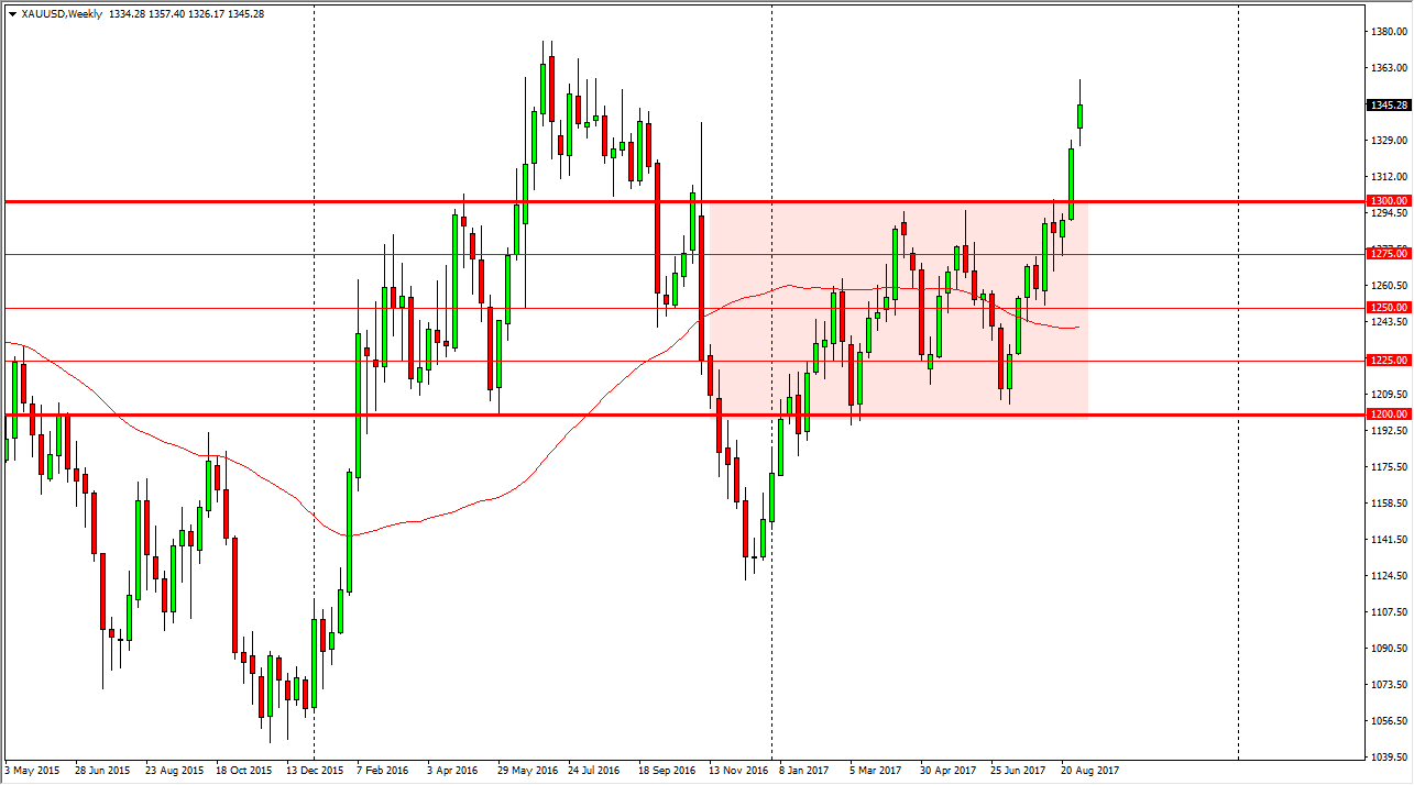 Gold markets gapped higher at the open on Monday, but then fell to fill that gap. Ultimately, we reached as high as $1355 or so, and then pulled back