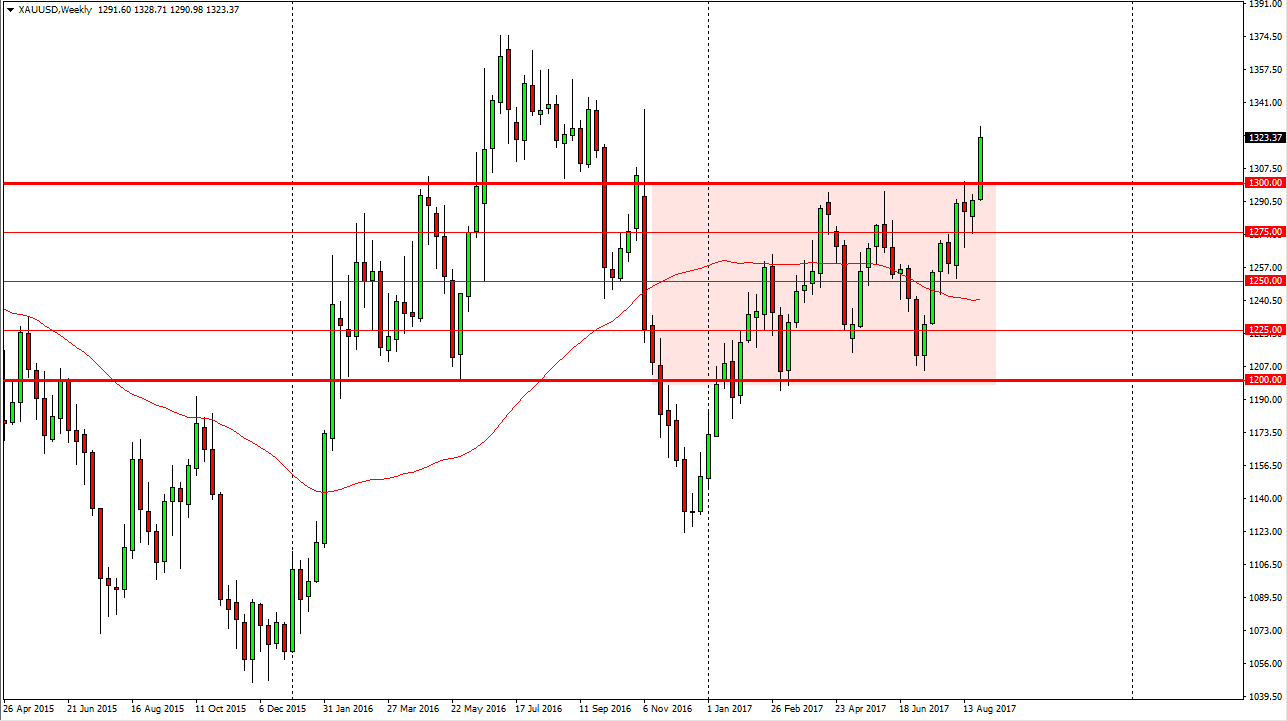 Gold markets broke down during the week, slicing through the $1300 level. By closing towards the top of the weekly candle, it suggests that we are in fact going to continue to go to the upside. I look at pullbacks as buying opportunities, as the market should then go towards the $1350 level above. I believe that $1300 level underneath should be massively supportive, so I would look at that as a potential value play. Longer-term, the market should then go to the $1400 level, based upon the size of the consolidated area we just broke out of.