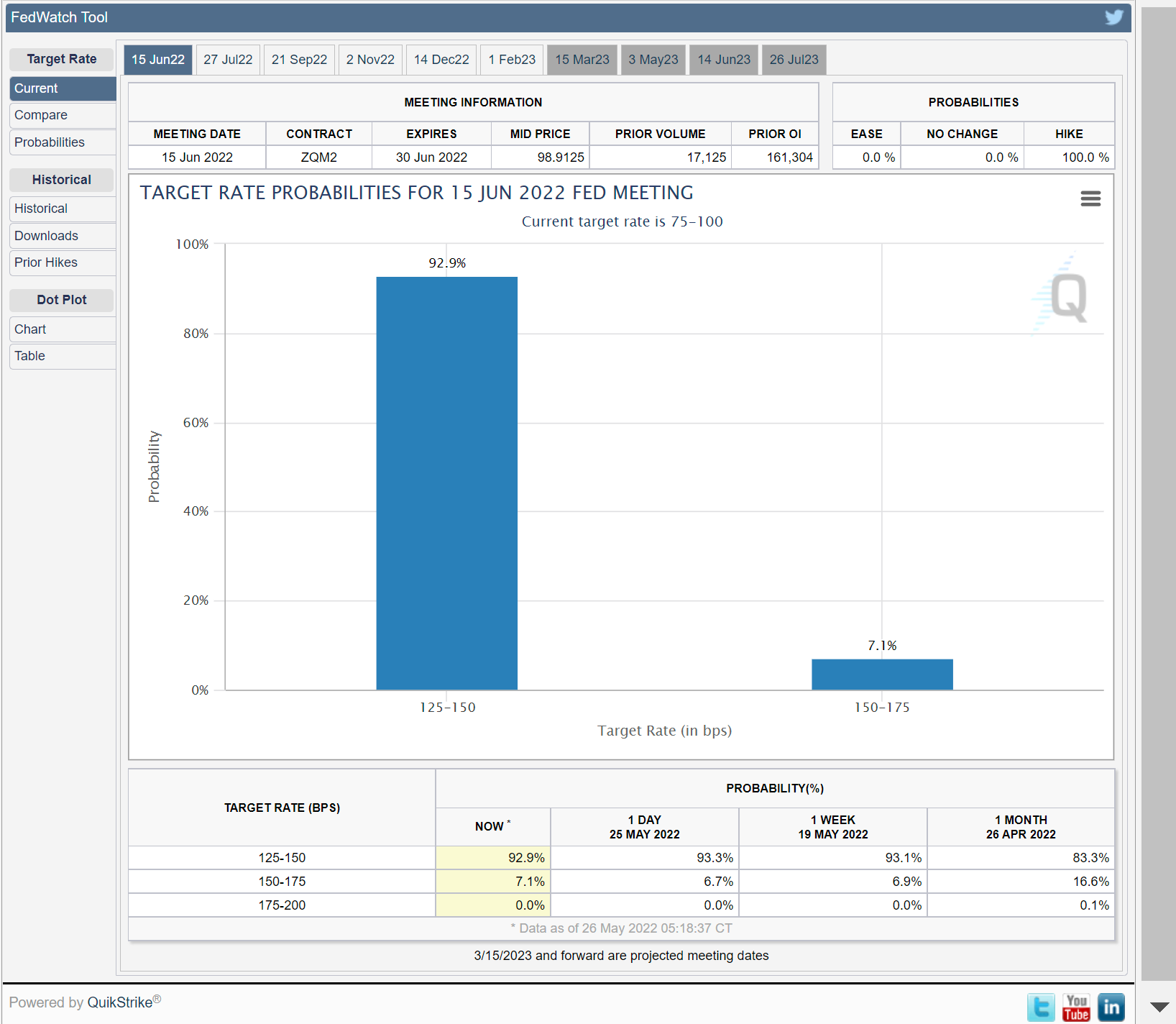 Currently, market participants are anticipating that both the June and July FOMC meetings will result in ½% interest rate hikes at each meeting. According to the CME’s Fedwatch tool, there is a 92.9% probability that the Fed will raise their fed funds rate to between 125 – 150 basis points and a 88% probability that there will be an additional interest rate hike enacted during the July FOMC meeting taking fed funds rates to 175 – 200 basis points, moving the fed funds rates to between 1 1/3% to 2%.