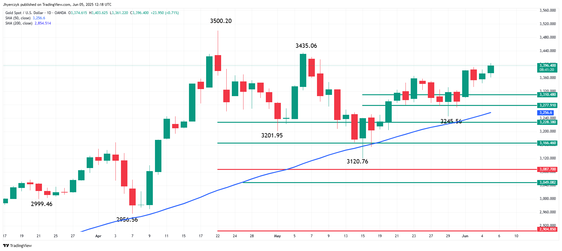 A break above that level could bring the $3500.20 top into focus. The 50-day moving average, currently at $3256.60, continues to underpin the rally, reinforcing the short-term bullish bias.