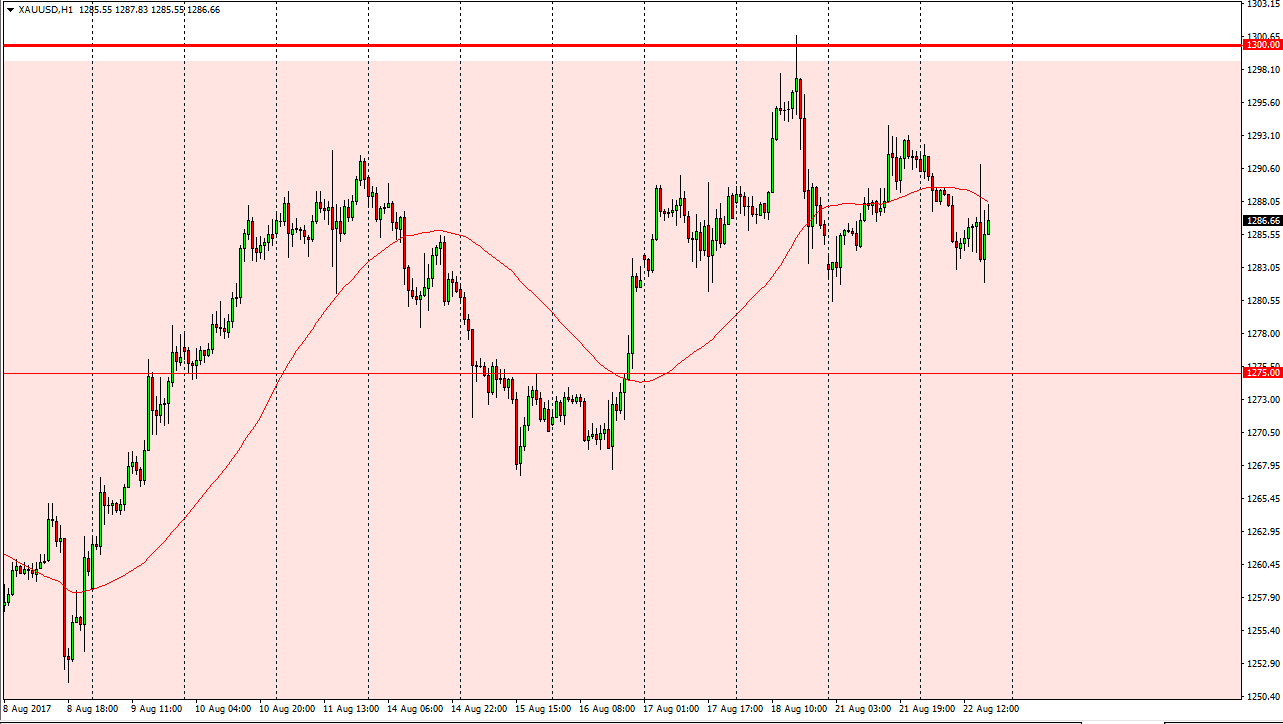 Gold markets fell during the Tuesday trading session as we are starting to see a little bit more stability in the financial markets. Some of the fear trade is starting to abate, and that is negative for gold, at least in the current situation. The question will be what comes out of Jackson Hole, and more importantly – Janet Yellen. She will decide what happens with the US dollar next, and that will most certainly have an effect on where gold goes. Because of this, we may have a quiet session ahead of us, as we continue to churn. At this point, the $1300 level is obviously a major resistance barrier.