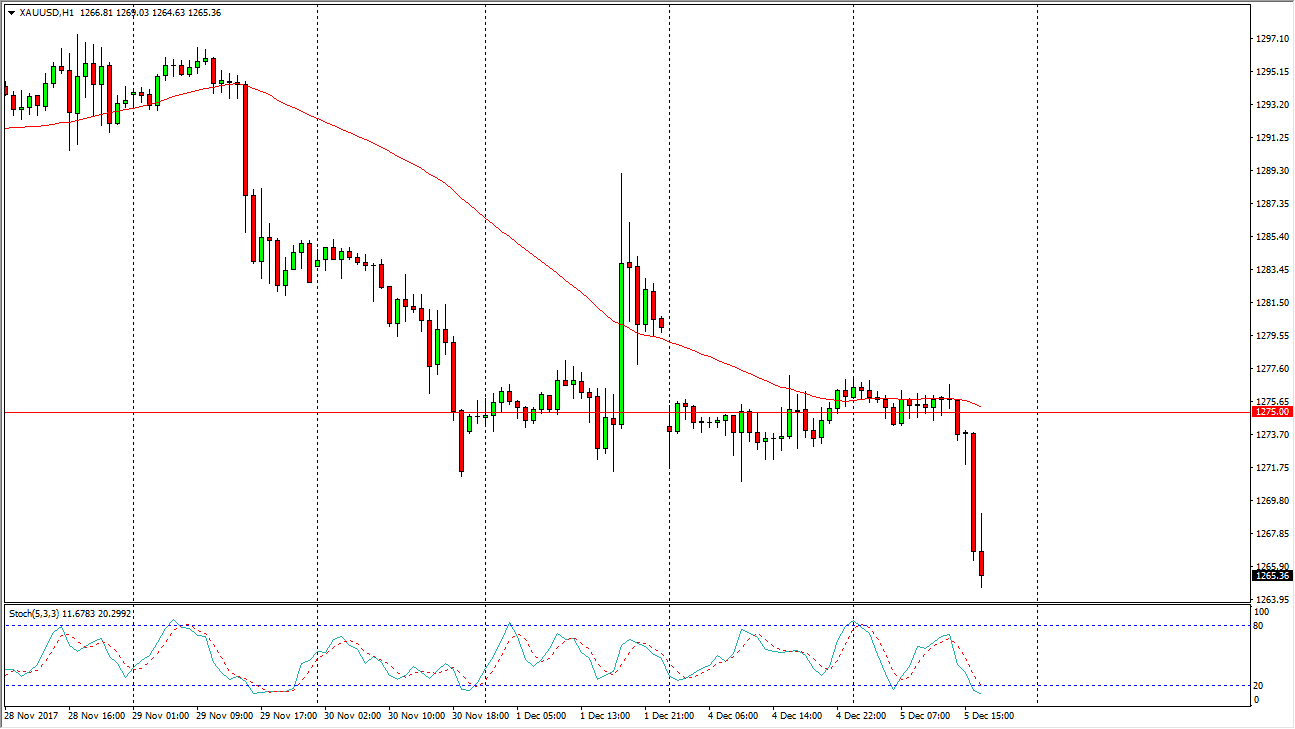 The gold markets initially went sideways during the trading session on Tuesday, using the $1275 level as a bit of an anchor for markets. Ultimately, it looks as if the market will continue to sell rallies, but when I look at the hourly chart, it looks like we are going to get that bounce relatively soon as the stochastic oscillator is starting to cross over in the oversold region, so therefore waiting for a small bounce might be a nice opportunity to short again. I believe that the $1275 level should continue to be a bit of a “ceiling” in the market, least in the short term. The US dollar is starting to rally significantly, due to the idea of tax reform coming out of the United States Congress.