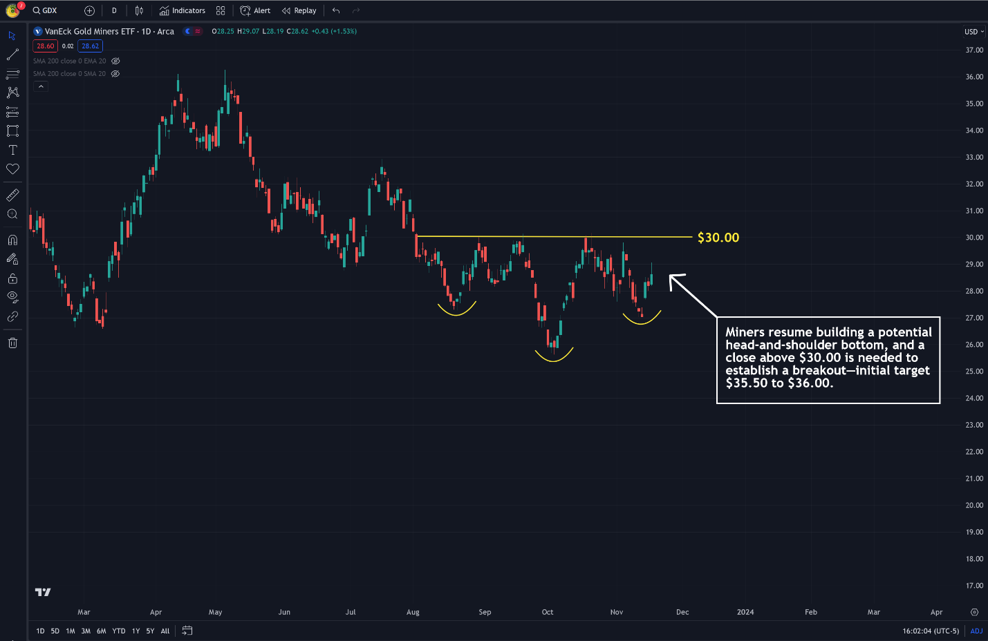 Miners resume building a potential head-and-shoulder bottom, and a close above $30.00 is needed to establish a breakout—initial target $35.50 to $36.00.