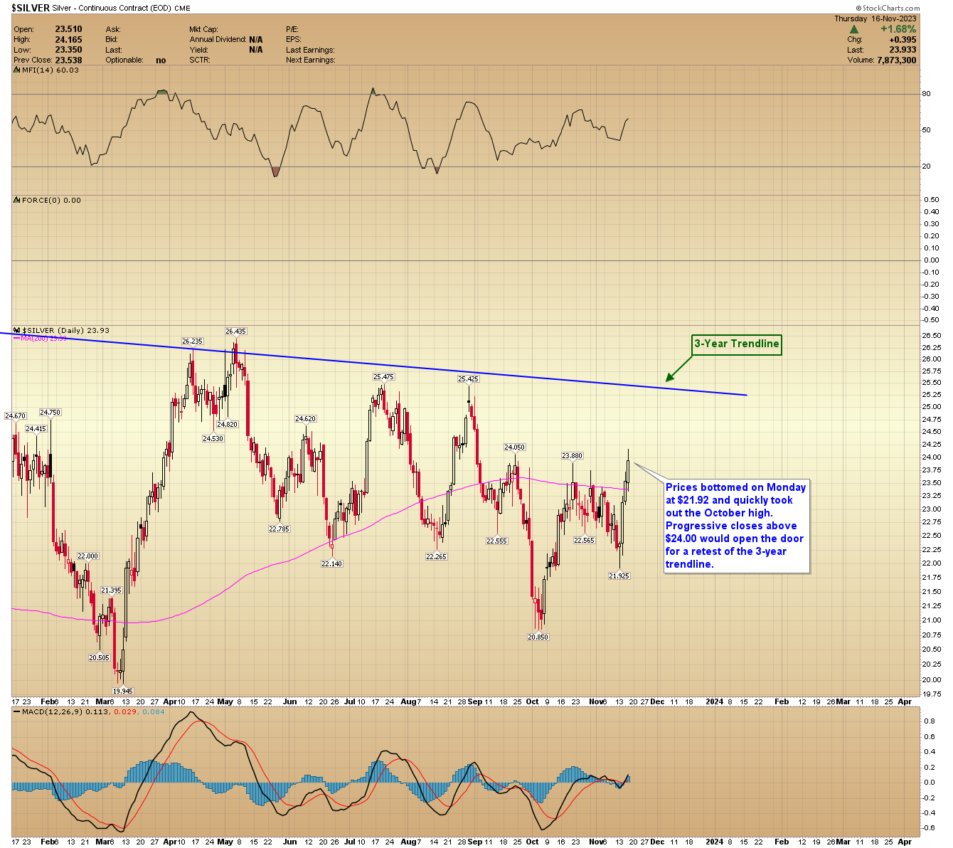 Prices bottomed on Monday at $21.92 and quickly took out the October high. Progressive closes above $24.00 would open the door for a retest of the 3-year trendline.