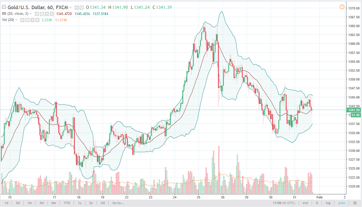 Gold markets have rallied a bit during the day on Wednesday, but quite frankly it is a little bit stagnant. I believe that the market should continue to go higher longer-term, based upon the US dollar falling. We have the jobs number coming out on Friday that could have a significant amount of influence on the US dollar, which of course has a massive effect on the gold markets. I think that there is an opportunity to buy gold on these dips for the longer-term trader, but in the short term if we can break above the $1350 level, the market should continue to go even higher.