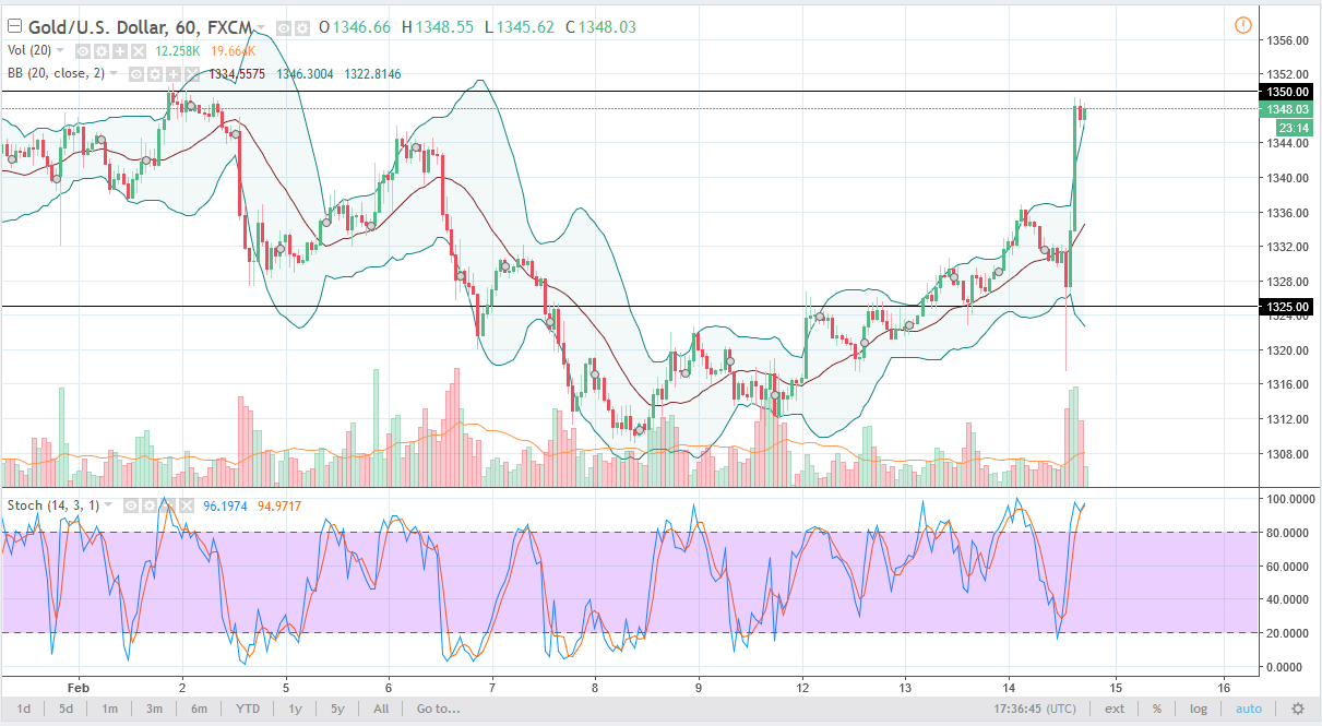 Gold markets have been very volatile during the trading session on Wednesday, after the CPI numbers have shocked the market, but as you can see we have turned around and reached towards the $1350 level.