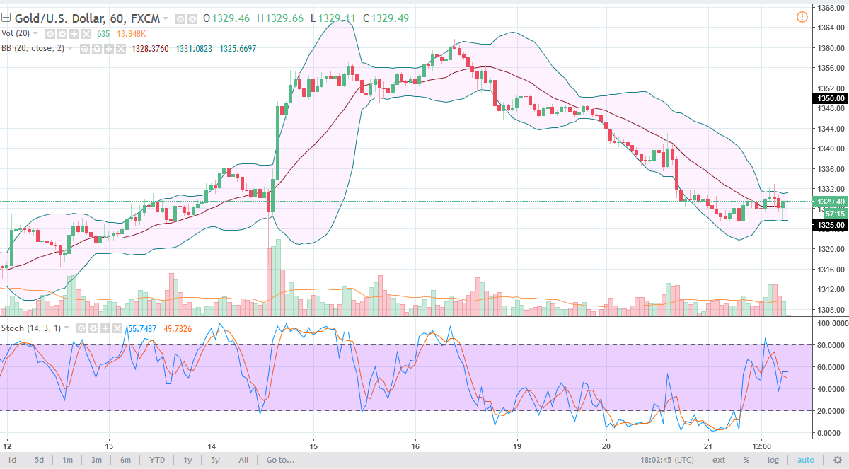 Gold markets went back and forth during the trading session on Wednesday, bouncing around the $1325 level. By settling on essentially not moving, the market looks like we are trying to build up a bit of confidence, something that might have been shattered over the last 3 sessions.
